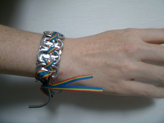 So for day four, I have a pretty cute little soda tab braclet. It was a pain in the butt. I will not lie to you. After a while you get a hang of the threading pattern, but it was a pain. Either that or the headache I had from work, just overwhelmed me. : (. But a promise is a promise. I have been seeing all over the place that Kristen Stewart from Twilight wears one of these, so for you Twilight fans, or recycled accessory fans. Here are the results.